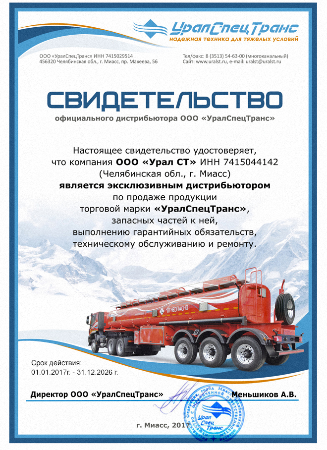 Мы являемся официальными партнерам ООО "УралСпецТранс" (ИНН 7415029514), наше предприятие поставляет всю номенклатуру технику производства машиностроительного завода "УралСпецТранс".