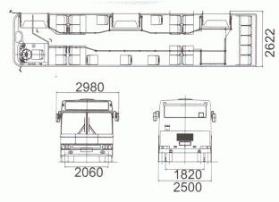 4х2, Двиг. Cat-3116 (Евро2), КПП ZF S6-85, мост Мадара, 45 мест, номинальная вместимость 77 чел, пригородный