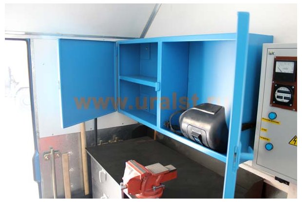 Кузов-фургон агрегата наземного ремонта водоводов разделен на 2 отсека: грузовой и ремонтная мастерская. Отсек-мастерская оснащен всем необходимым оборудованием и инвентарем для проведения ремонтных и восстановительных работ. Планировка и расположение оборудования произведены с учетом максимально полезного использования пространства мастерской и удобства работы персонала.