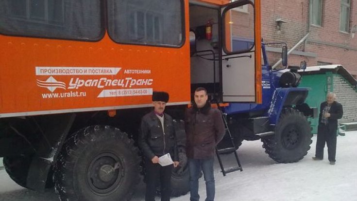 Автобус вахтовый Урал с колесной формулой 6х6 на полноприводном шасси Урал 4320-1112-61 оборудован кузовом-фургоном с низким полом и предназначен для оперативной доставки рабочих (ремонтных, строительных, геолого-разведывательных и т.п.) бригад в количестве 20 человек на объект.
