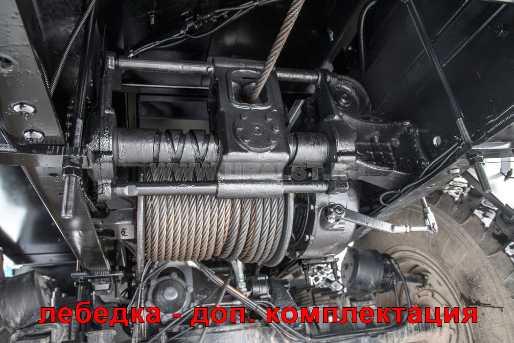 Вахтовый автобус УСТ-5453 оборудован задней механической лебедкой (доп. комплектация) для самовытаскивания автомобиля с червячным редуктором и тросоукладчиком.