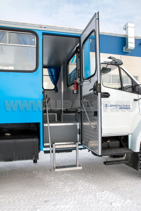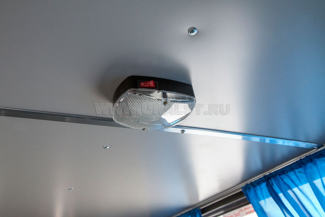 Обниженный вход в совокупности с откидной двухступенчатой лестницей обеспечивают максимальное сочетание удобства посадки пассажиров и компактность в транспортном положении. Ступеньки лестницы выполнены из листа рифленой нержавеющей стали. Лестница оборудована поручнем. Для освещения входной группы при посадки и высадки пассажиров устанавливается плафон подсветки.