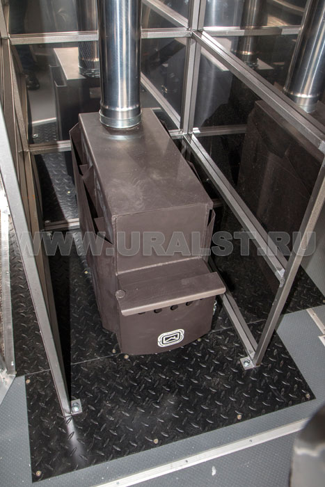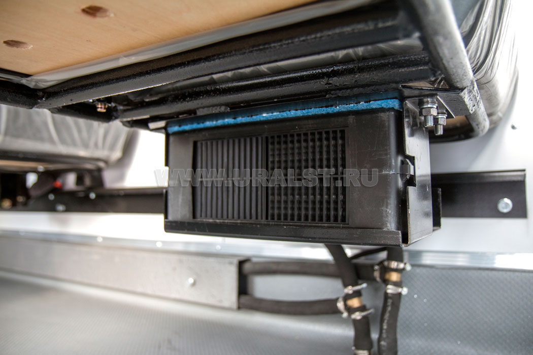 Отопитель основного контура устанавливается под пассажирское сиденье. В вахтовых автобусах «УралСпецТранс» применяются зависимые отопители с теплопроизводительностью от 4 до 8 кВт. Основной контур отопления работает за счет отбора тепла от системы охлаждения ДВС.