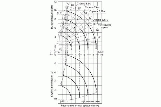 Выдвижение стрелы, м Мин. 3,25