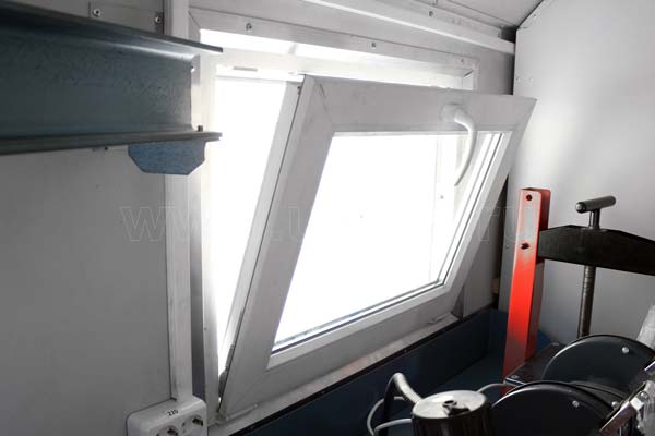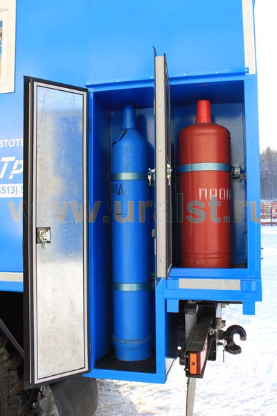 Навеска ПАРМ-02Т комплектуется cпециальными нишами для хранения и транспортировки газосварочных баллонов, которые позволяют увеличить рабочее пространство внутри кузова-фургона. Для удобства монтажа оборудования и доступа к нему одна из ниш опущена ниже уровня рамы шасси.Выдвижной трап и съемная лестница