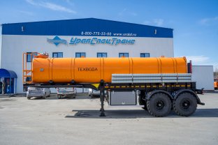 Полуприцеп цистерна для технической воды, 18 м3, рамный, чемодан, термос, 1 секция, 2 оси, односкатный, шины 425/85 R21, рессорно-балансирная подвеска, паровые трубы, слив Ду100 в заднем утепленном ящике