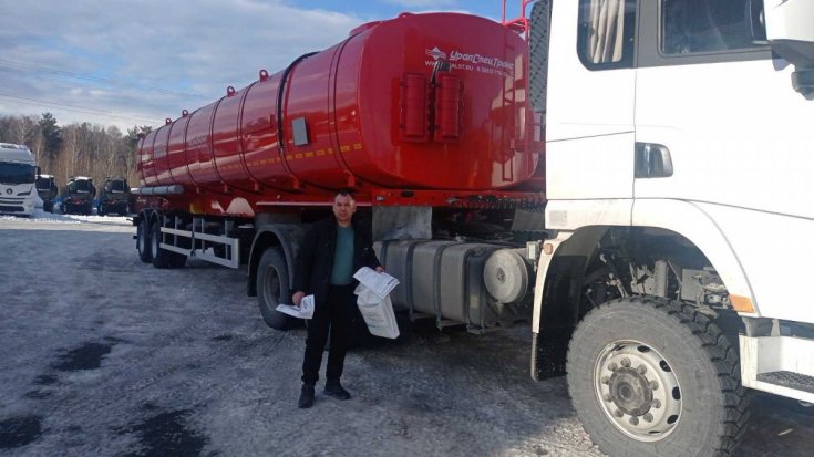 Полуприцеп цистерна нефтевоз, 40 м3, рамный, чемодан, 1 секция, 2 оси, двускатный, шины 315/80 R22.5, рессорно-балансирная подвеска без РШ (центральный балансир), утепление 100 мм, паровые трубы, корзина ДЗК полуприцепа, ДЗК тягача, корзина ЗИП, одна горловина
