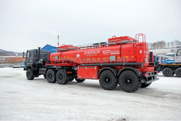 Полуприцеп-цистерна «УралСпецТранс» имеет рамную конструкцию – емкость укладывается в ложементы рамы полуприцепа, рама устанавливается на тележку. Фиксация цистерны на ложементах при помощи стяжных лент обеспечивает небольшую свободу емкости при скручивании рамы, что дополнительно снижет нагрузку на саму емкость. Такая конструкция имеет большую прочность и надежность за счет того, что большая часть динамических нагрузок при движении приходится на раму. Стальная рама полуприцепа-цистерны из сварного профиля имеет большой запас прочности, дополнительную жесткость конструкции предают вваренные усилители.