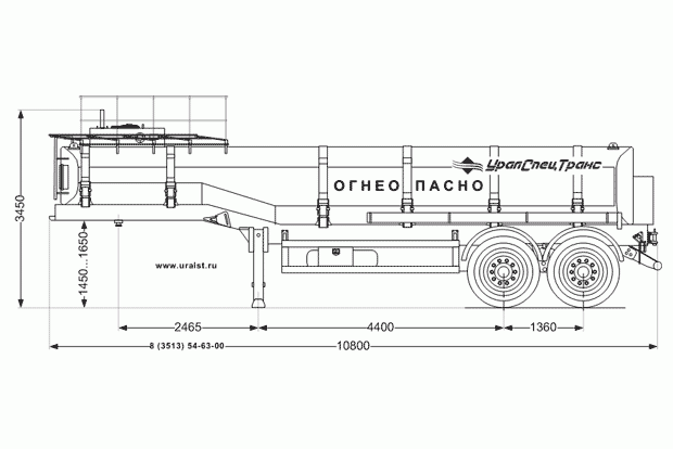 Полуприцеп-цистерна «УралСпецТранс» имеет рамную конструкцию – емкость укладывается в ложементы рамы полуприцепа, рама устанавливается на тележку. Фиксация цистерны на ложементах при помощи стяжных лент обеспечивает небольшую свободу емкости при скручивании рамы, что дополнительно снижет нагрузку на саму емкость. Такая конструкция имеет большую прочность и надежность за счет того, что большая часть динамических нагрузок при движении приходится на раму. Стальная рама полуприцепа-цистерны из гнутого профиля имеет большой запас прочности, дополнительную жесткость конструкции предают вваренные усилители.