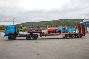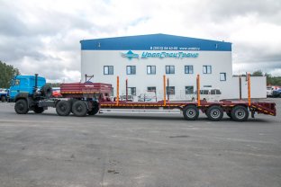 Полуприцеп тяжеловоз, эксплуатация в габарите с доработанным тягачом, 45 тн, 3 оси, односкатный, пневматическая подвеска, 445/65 R22,5, вставные раздвижные коники, приставные трапы, съёмные борта и стойки, уширители, доски, доп. комплект уширителей вместо коников, фитинги для перевозки контейнеров 20 и 40 фут, отбойные брусья, 3 ящика ЗИП, TEBS, топливный бак 500л, погружной насос 24В, ДЗК с лебедкой, габаритные указатели со стробоскопами, проблесковый маяк, платформа 12200х2470(3300)х1270 мм