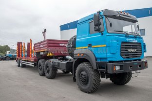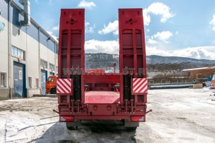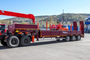Полуприцеп тяжеловоз, эксплуатация в габарите с доработанным тягачом, 45 тн, 3 оси, односкатный, пневматическая подвеска, оси BPW, шины 445/65 R22,5, вставные раздвижные коники, приставные трапы, съёмные борта и стойки, уширители, доски, доп. комплект уширителей вместо коников, фитинги для перевозки контейнеров 20 и 40 фут, отбойные брусья, 3 ящика ЗИП, тормозная систеема TEBS, топливный бак 500л, погружной насос 24В, ДЗК с лебедкой, габаритные указатели со стробоскопами, проблесковый маяк