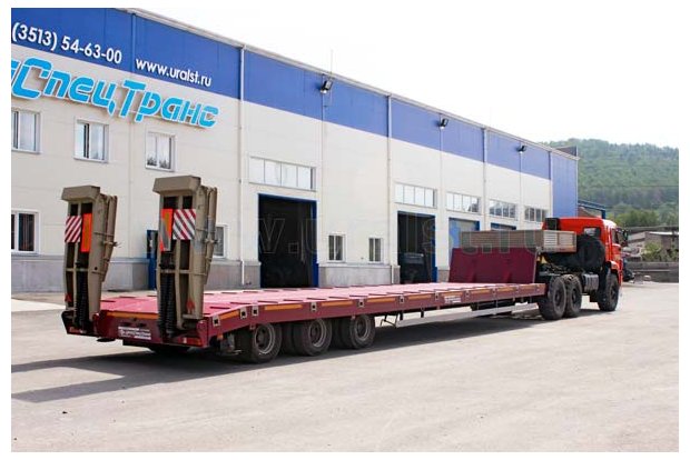 Полуприцеп тяжеловозный предназначен для перевозки автомобилей и дорожно-строительной техники (асфальтоукладчиков, бульдозеров, экскаваторов) весом до 41,5 тонны.