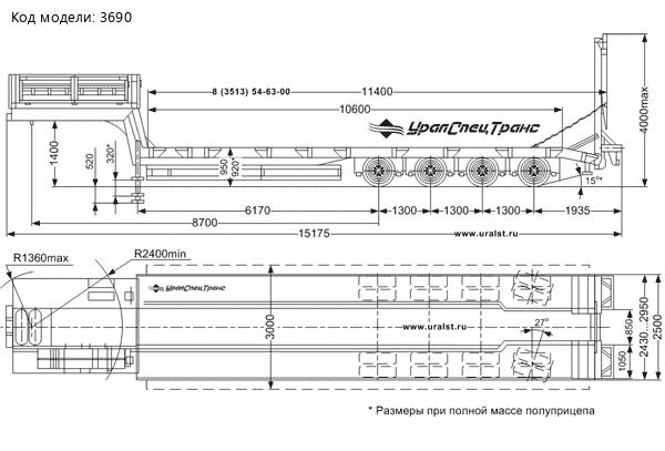 Полуприцеп тяжеловозный предназначен для перевозки автомобилей и дорожно-строительной техники (асфальтоукладчиков, бульдозеров, экскаваторов) весом до 53,5 тонн.