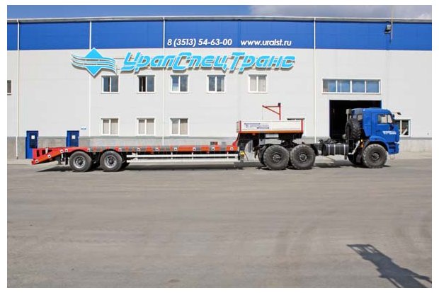Полуприцеп тяжеловозный предназначен для перевозки автомобилей и дорожно-строительной техники (асфальтоукладчиков, бульдозеров, экскаваторов) весом до 25 тонн.