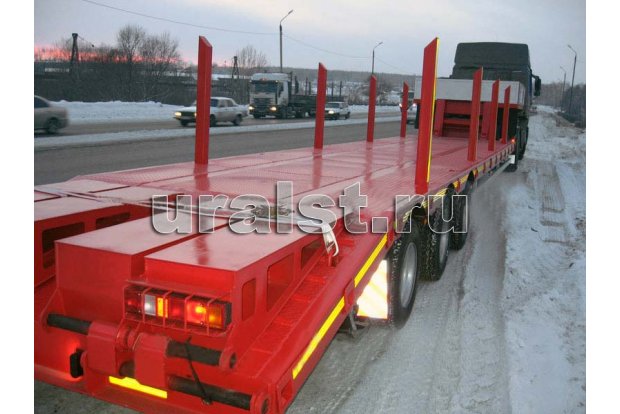 Полуприцеп тяжеловозный предназначен для перевозки автомобилей и дорожно-строительной техники (асфальтоукладчиков, бульдозеров, экскаваторов) весом до 39 тонн.