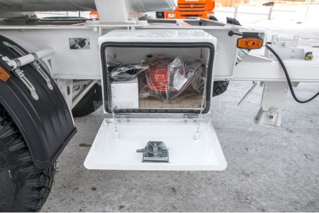 | Крепление цистерны | Ложементы закреплены к раме прицепа. Цистерна установлена в ложементах через резиновый демпфер и закреплена стяжными лентами. |