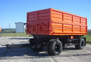 Прицеп самосвальный, 10 тн, 17,5 м3, 2 оси, двускатный, шины 10R20, рессорная подвеска, трехсторонняя разгрузка, навеска верхних бортов-верхняя, нижних-нижняя. Нижний борт открывается на 110 град.