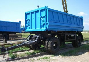 Прицеп самосвальный, 15 тн, 17,5 м3, 2 оси, двускатный, шины 10R20, рессорная подвеска, трехсторонняя разгрузка, навеска верхних бортов-верхняя, нижних-нижняя. Нижний борт открывается на 110 град.