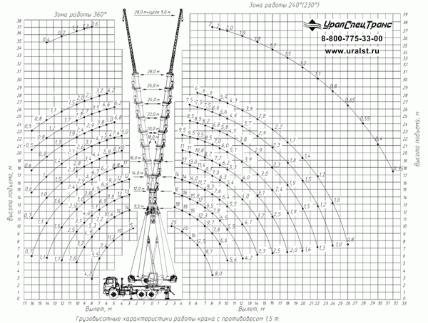 | Максимальная масса груза, с которой допускается телескопирование стрелы, в соответствии с грузовыми характеристиками, на выдвинутых балках выносных опор, т: - при длине стрелы от 9,5м до 18,0м - при длине стрелы от 18,0м до 22,0м - при длине стрелы от 22,0м до 26,0м - при длине стрелы от 26,0 до 28,0м |