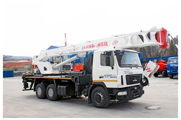 Автокран Челябинец КС-55732 с четырехсекционной, телескопической стрелой 28,1 м и грузоподъемностью 25 тонн. Автокран КС изготовлен на выносливом, надежном и комфортном шасси МАЗ-6312B3.