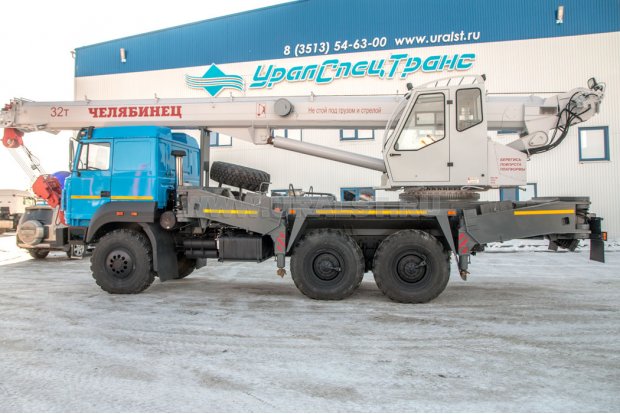 Автокран Челябинец КС-55733 грузоподъемностью 32 тонны предназначен для выполнения грузоподъемных работ, а также для обслуживания зданий, сооружений и устройств городского хозяйства, линий электропередач и связи, воздуховодов, производства ремонтных и строительно-монтажных работ.