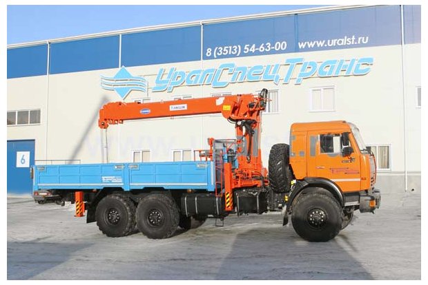 Бортовой автомобиль на шасси Камаз 43118-1098-10 предназначен для перевозки грузов по всем видам дорог и местности. На бортовой автомобиль установлен манипулятор Kanglim KS-2056H, обеспечивающий проведение грузоподъемных работ весом до 7,1 тонн.