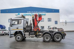 6х6, кабина Х3000 с одним сп. местом, двигатель WP12.430E50 (430 л.с.), КПП 12JSDX220A-B, шины 315/80R22,5, шкв. 2" (ССУ 1500 мм), кондиционер, эл.стеклоподъемники, зеркала з/вида с эл.управлением и подогревом, пневмоподвеска сиденья вод., алюм.т/бак 500л., ABS WABCO, МОБ + МКБ всех ведущих мостов, КМУ HUBEI SQ8S4 (20,0 тн/м, 8000 кг на 2,5 м, 12,2 м), ПЖД, воздушный отопитель кабины, инвертор 24/220В, полная масса автопоезда 67 тонн