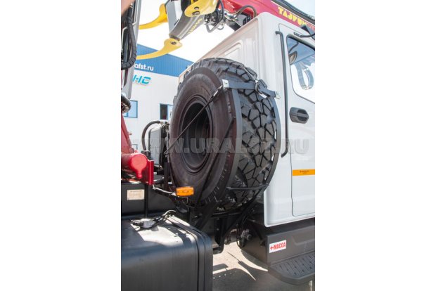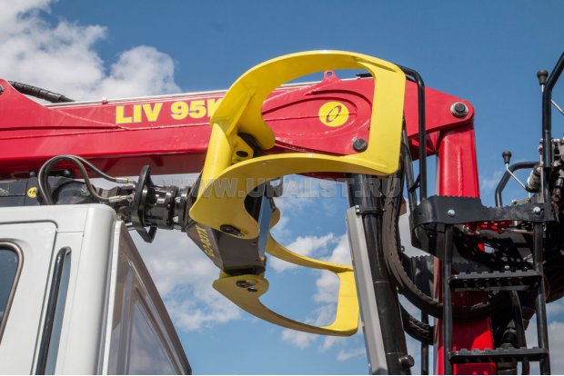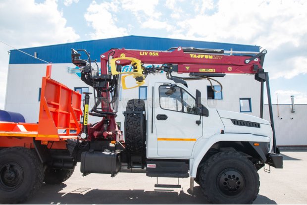За кабиной лесовозного автомобиля установлен манипулятор Тайфун Лиф 95 К обеспечивающий проведение грузоподъемных работ весом до 3,1 тонн.