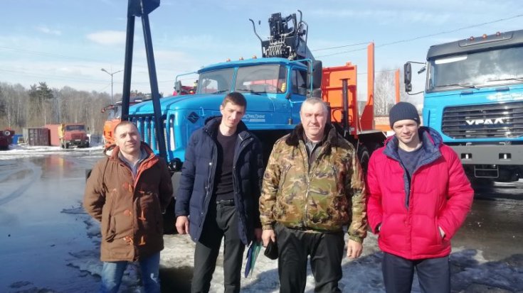 За кабиной лесовозного автомобиля установлен манипулятор VM10L обеспечивающий проведение грузоподъемных работ весом до 3,1 тонн.