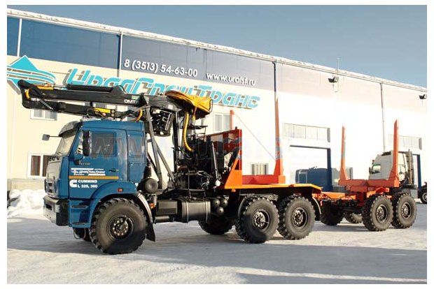 Лесовозный тягач на шасси автомобиля Камаз 43118-RB с гидроманипулятором ОМТЛ-97 предназначен для погрузки, разгрузки и транспортировки сортиментов и хлыстов длиной до 23 метров в составе автопоезда по всем видам дорог и местности.