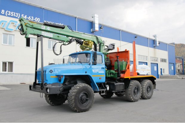 Лесовозный тягач на шасси Урал 5557-1112-60 предназначен для транспортировки стволов деревьев, сортиментов и хлыстов длиной до 23 метров в составе автопоезда по всем видам дорог и местности. За кабиной лесовоза смонтирован кран-манипулятор Атлант-90, обеспечивающий проведение операций самопогрузки, а также, загрузки другой лесовозной автотехники.
