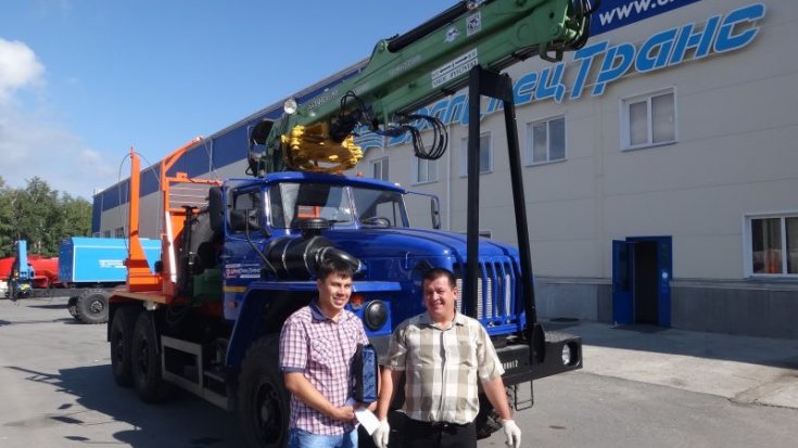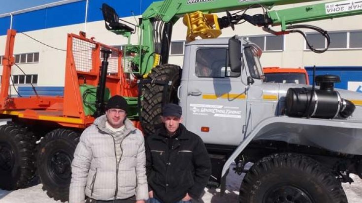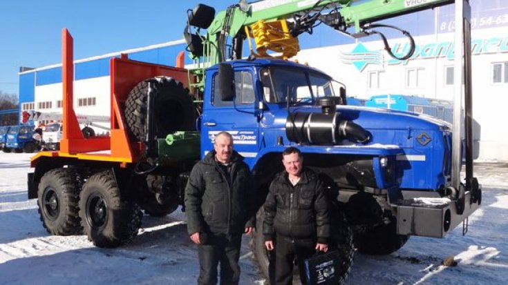 Лесовозный тягач на шасси Урал 5557-1112-60 предназначен для транспортировки стволов деревьев, сортиментов и хлыстов длиной до 23 метров в составе автопоезда по всем видам дорог и местности. За кабиной лесовоза смонтирован кран-манипулятор Атлант-90, обеспечивающий проведение операций самопогрузки, а также, загрузки другой лесовозной автотехники.