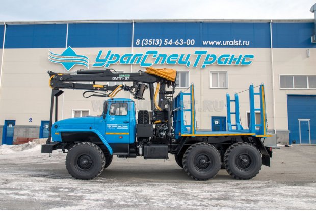 Лесовозный тягач УСТ-5453 предназначен для транспортировки стволов деревьев, сортиментов и хлыстов длиной до 23 метров в составе автопоезда по всем видам дорог и местности. Лесовоз оборудован гидроманипулятором ОМТЛ-97.
