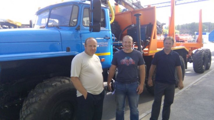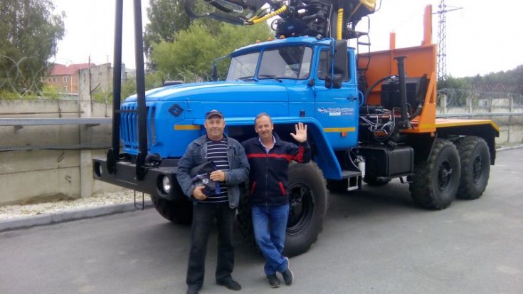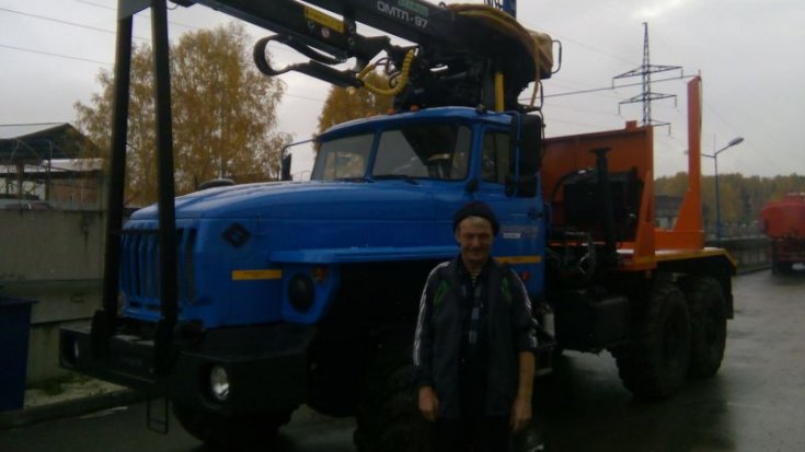 Лесовозный тягач на шасси Урал 5557-1112-60 предназначен для транспортировки стволов деревьев, сортиментов и хлыстов длиной до 23 метров в составе автопоезда по всем видам дорог и местности. За кабиной лесовоза смонтирован кран-манипулятор ОМТЛ-97, обеспечивающий проведение операций самопогрузки, а также, загрузки другой лесовозной автотехники.