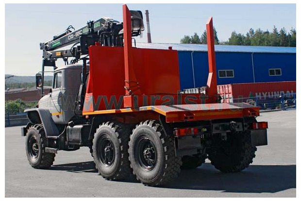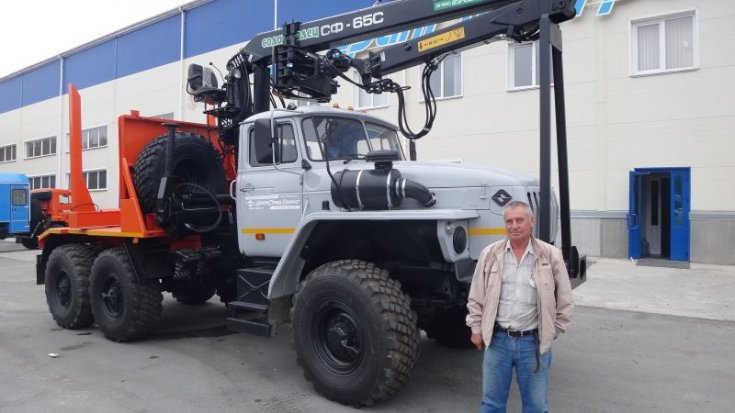 Лесовозный тягач на шасси Урал 5557-1112-60 предназначен для транспортировки стволов деревьев, сортиментов и хлыстов длиной до 23 метров в составе автопоезда по всем видам дорог и местности. За кабиной лесовоза смонтирован ГМ СФ-65, обеспечивающий проведение операций самопогрузки, а также, загрузки другой лесовозной автотехники.