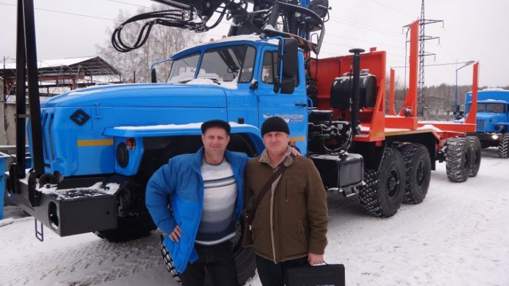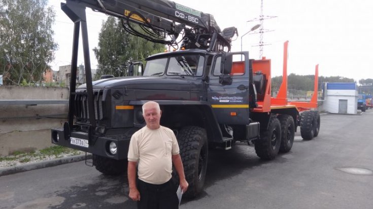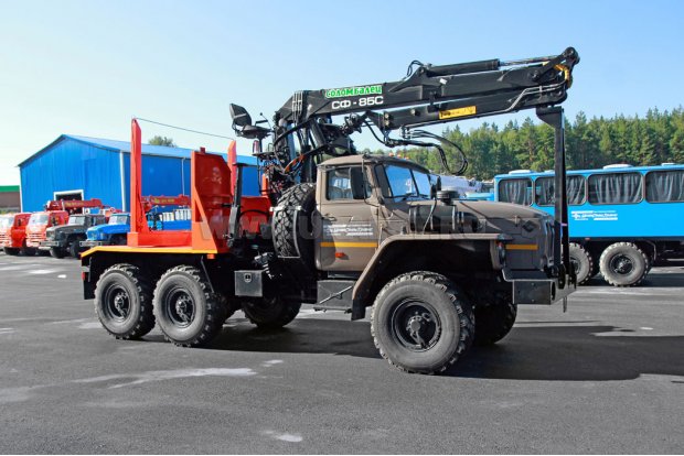 Лесовозный тягач Урал 55571-60 предназначен для погрузки, разгрузки и транспортировки стволов деревьев, сортиментов и хлыстов длиной до 23 метров в составе автопоезда по дорогам общего пользования, а также вне дорог общего пользования. За кабиной лесовоза смонтирован манипулятор СФ-85С.