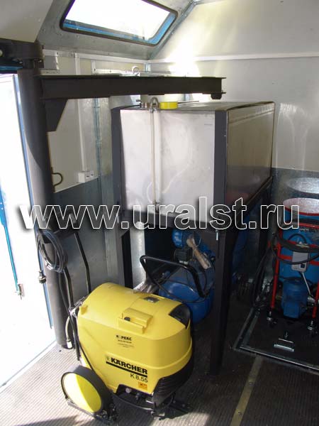 Кузов-фургон маслостанции имеет высокопрочную каркасную конструкцию, обшитую снаружи металлическими листами. Внутренняя отделка кузова-фургона выполнена промышленным пластиком. Нижняя часть стен кузова-фургона обшита оцинкованным стальным листом, пол покрыт рифленой резиной. Такой вариант отделки более практичен для ремонтных работ. Двери, люки и открывающиеся окна обрамлены уплотнителем с двух сторон, что позволяет закрывать их с наибольшей герметичностью. Пол изготовлен из шпунтованной доски толщиной 30 мм, пенополистирольного утеплителя, фанеры и покрыт рифленой резиной (толщина пола составляет 60-90 мм). Вся древесина обработана огнебиозащитным составом. По желанию Заказчика возможна установка «тёплых» полов с термодатчиком и регулятором температуры.