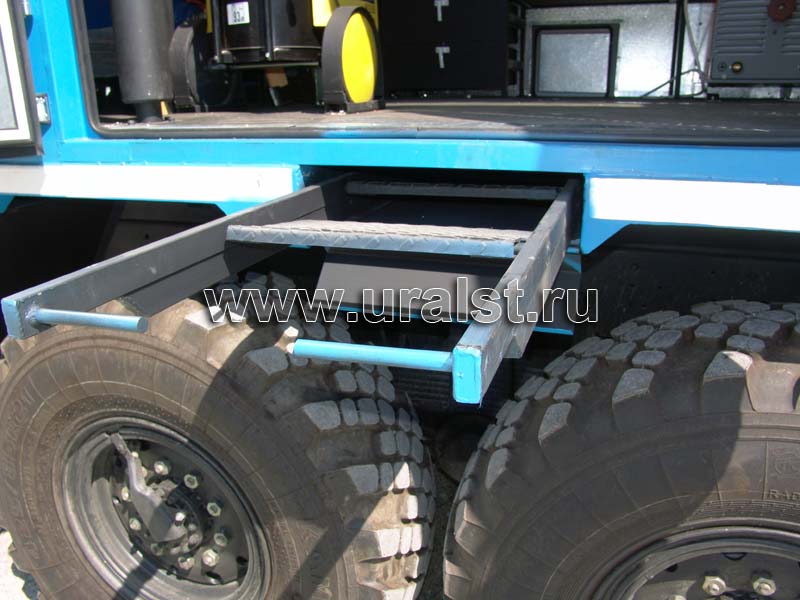 Еще одной особенностью маслостанции является выдвижной трап, по которому осуществляется вход внутрь фургона. Трап по сравнению с лестницей более травмобезопасен, по нему легче производить спуск / подъем внутрь передвижной мастерской. В транспортном положение трап убирается под пол кузова-фургона.