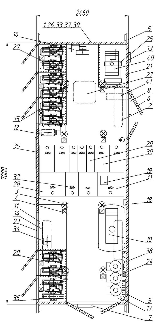 Перекачка масла из баков осуществляется электронасосными агрегатами НМШ. Насосы размещены на стойке-стеллаже, в нише под ними находятся самосматывающиеся катушки с заправочными пистолетами. Для вывода рукавов наружу кузова-фургона в боковых панелях предусмотрены технологические ниши.