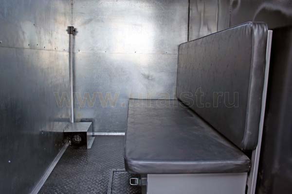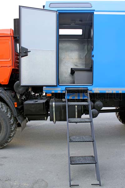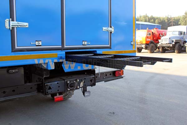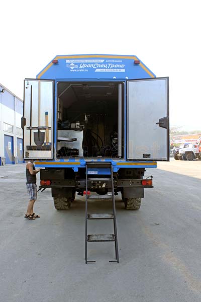 Еще одной особенностью фургона является выдвижной трап, по которому осуществляется вход персонала внутрь ремонтного отсека. Для удобства и экономии пространства трап в транспортном положении убираются в нишу под полом автофургона. Конструкция предусматривает широкие ступеньки, по которым легче производить спуск и подъем. Ступеньки трапа изготовлены из просечного стального листа, что исключает случайное соскальзование ноги.