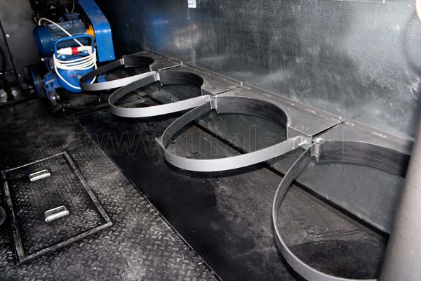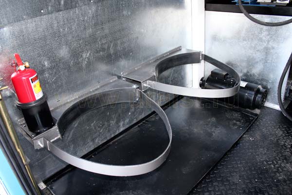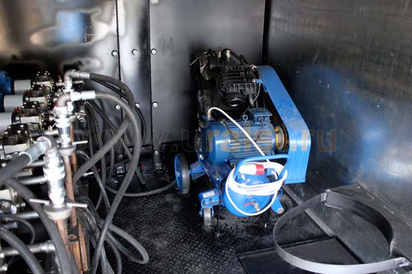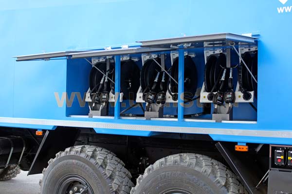Включение насосов происходит с помощью кнопок «стоп-пуск» пультов управления, расположенные под створками ниш с катушками. Для вывода рукавов наружу кузова-фургона в боковых панелях предусмотрены технологические ниши. Двери ниш обрамлены с двух сторон уплотнителем, запор дверей осуществляется при помощи врезных замков.