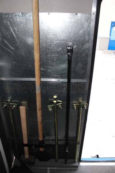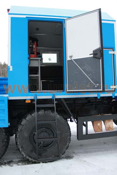 Еще одной особенностью фургона является съемная лестница, по которой осуществляется вход персонала внутрь ремонтного отсека. Для удобства и экономии пространства лестница в транспортном положении фиксируется на бортовой платформе в районе задней стенки кузова-фургона. Конструкция лестницы предусматривает широкие ступеньки, по которым легче производить спуск и подъем. Ступеньки изготовлены из стального рифленого листа, что делает их более травмобезопасным.