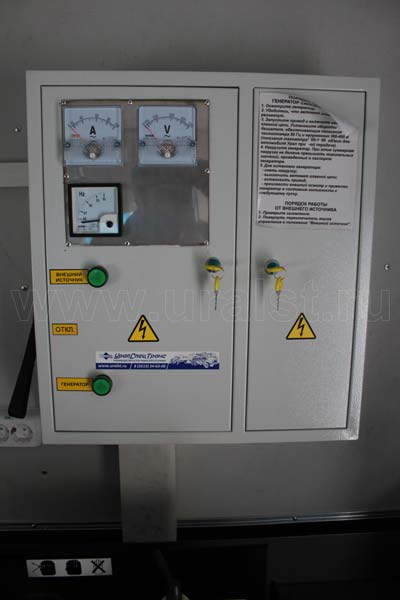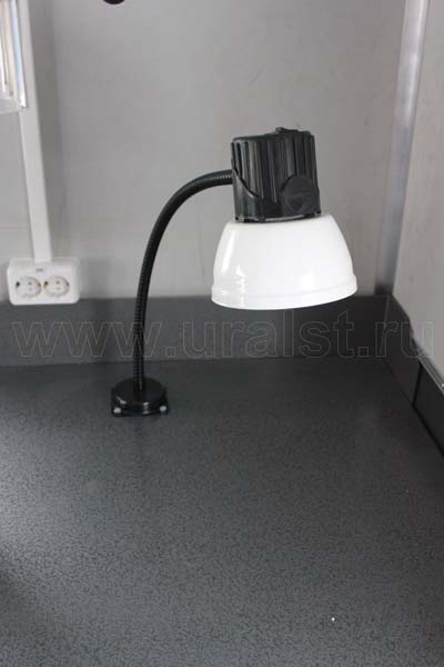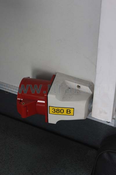 Фургон оборудован розетками для подключения потребителей 220 и 380V. Для работы в темное время суток все рабочие места фургона оборудованы плафонами освещения. Также фургон оборудуется переговорным устройством «кабина-салон».
