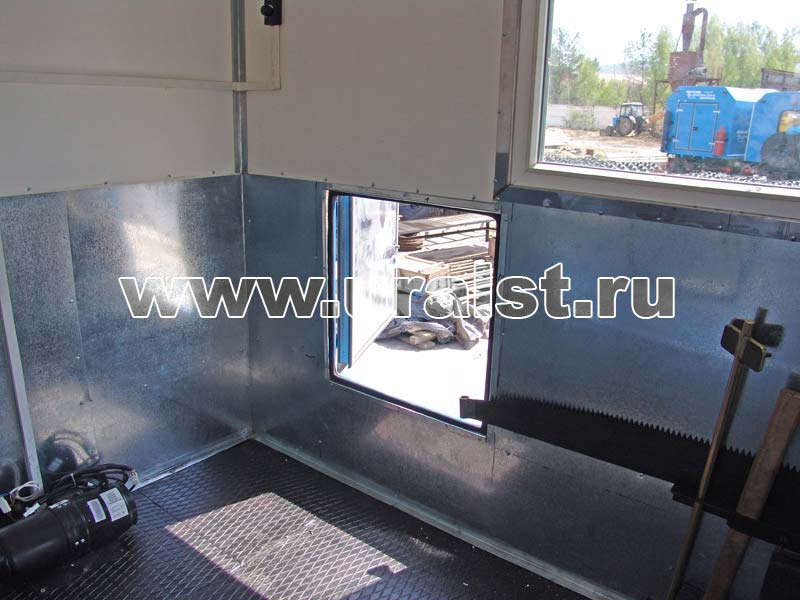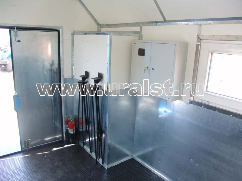 Кузов-фургон представляет собой каркасную сварную конструкцию, наружная обшивка – стальной лист, в качестве утеплителя используется пенополистерол. В зависимости от назначения и климатических условий эксплуатации толщина стеновых панелей может быть от 30 до 80 мм. Внутренняя отделка кузова-фургона выполнена промышленным пластиком. Нижняя часть стен АРСа обшита оцинкованным стальным листом, пол покрыт рифленой резиной. Такой вариант отделки более практичен для ремонтных работ.