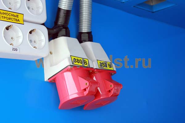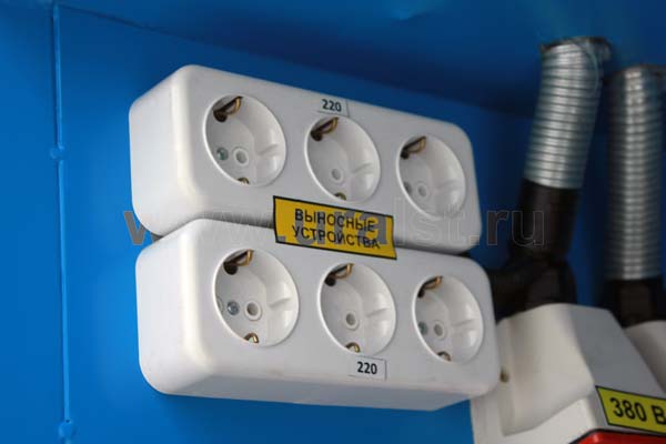 Фургон оборудован розетками для подключения потребителей 220 и 380V. Для работы в темное время суток все рабочие места фургона оборудованы плафонами освещения. Также фургон оборудуется переговорным устройством «кабина-салон».