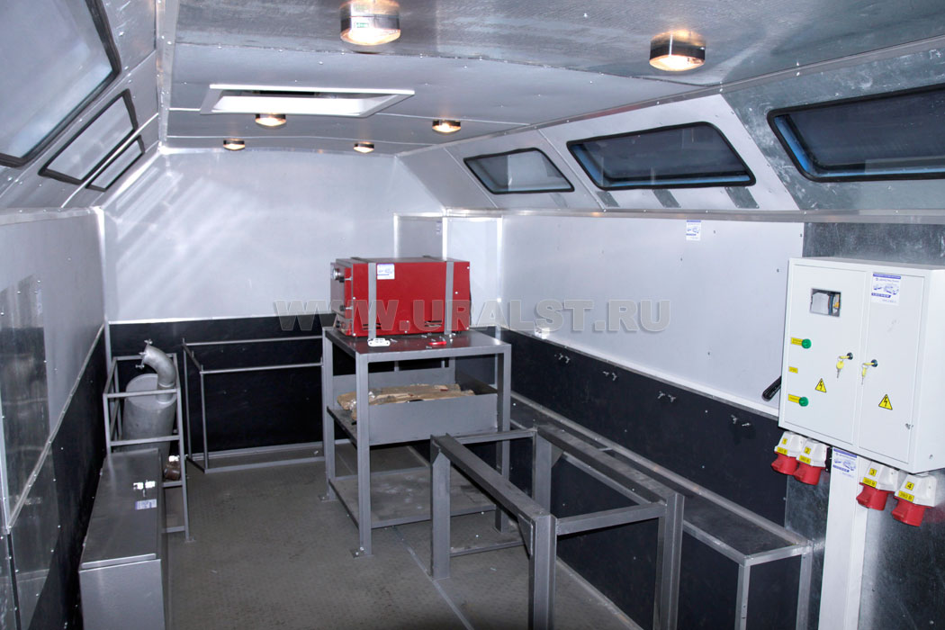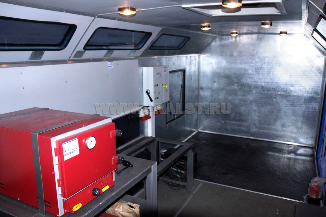Отделка стен и потолка автофургона высококачественным автомобильным пластиком (на 1 метр от пола применяется черный автомобильный пластик), а также износостойкое полимерное покрытие пола обеспечивают красивый внешний вид и долгий срок эксплуатации. В районе установки дизель-электростанции потолок и стены выполнены из оцинкованного листа.