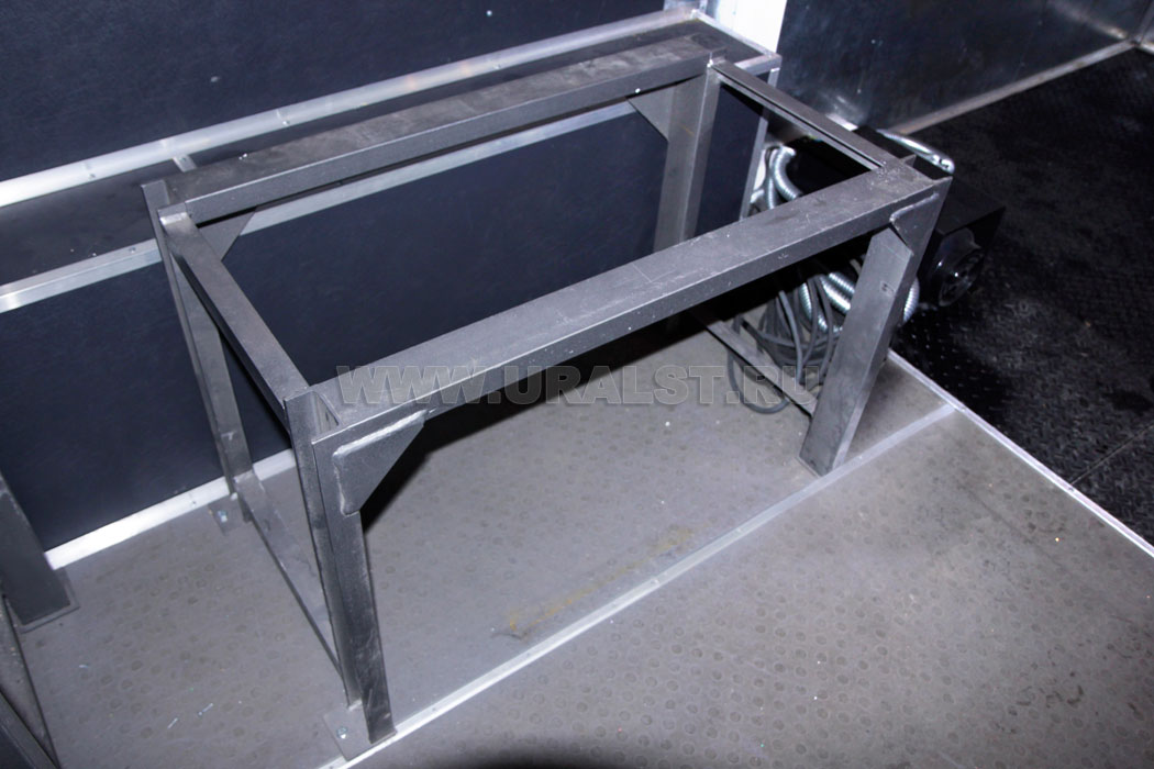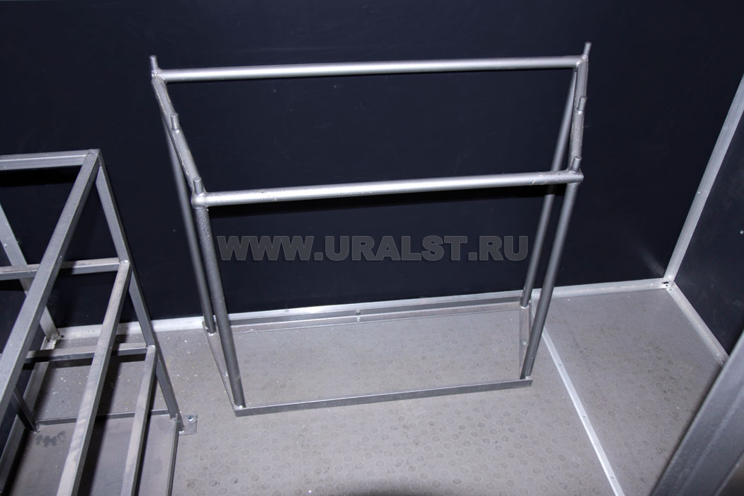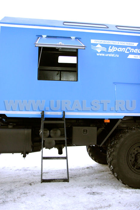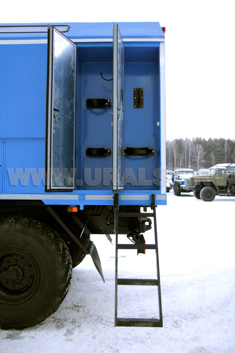 Вход персонала внутрь ремонтного отсека осуществляется по выдвижному трапу. Для удобства и экономии пространства трап в транспортном положении убирается в нишу под полом автофургона. Конструкция трапа предусматривает широкие ступеньки, по которым легче производить спуск и подъем.Организация бортовой электросети