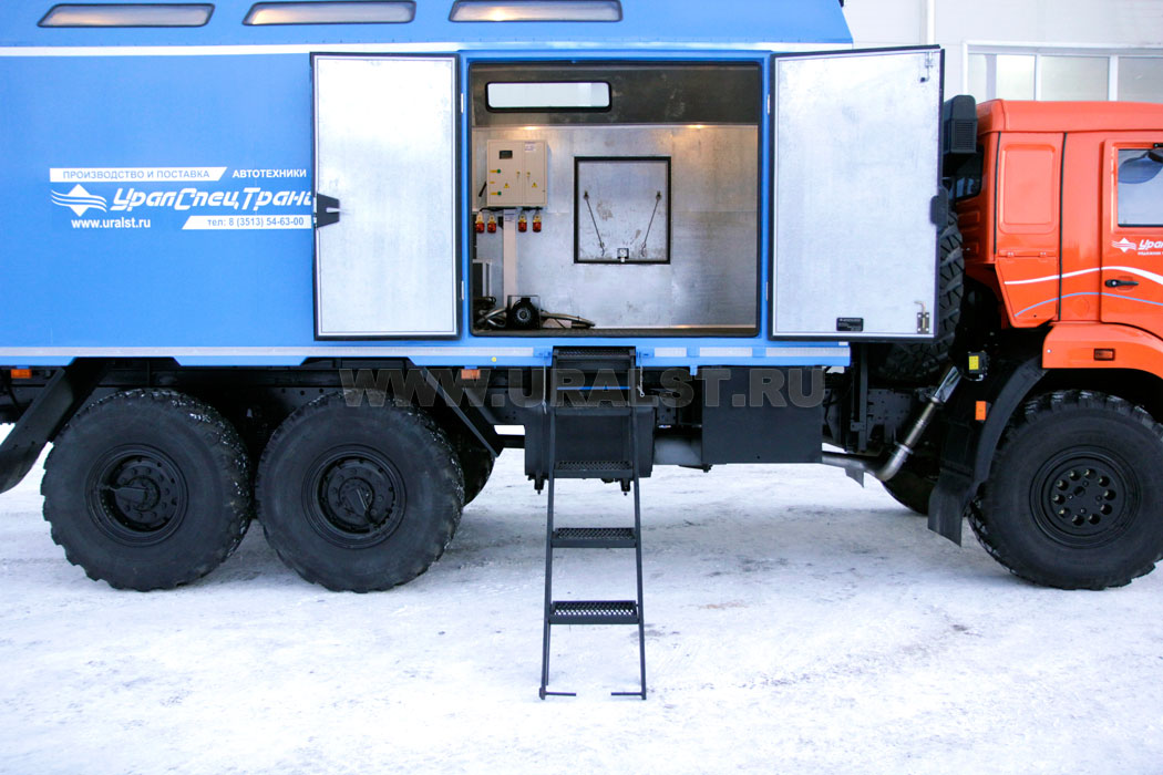 Агрегат ремонтно-сварочный Камаз может быть оснащен всем необходимым оборудованием и инвентарем для проведения ремонтно-сварочных работ. Планировка и расположение оборудования произведены с учетом максимально полезного использования пространства мастерской и удобства работы персонала.Выдвижной трап и съемная лестница