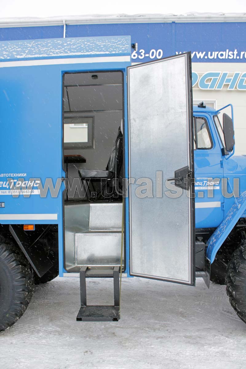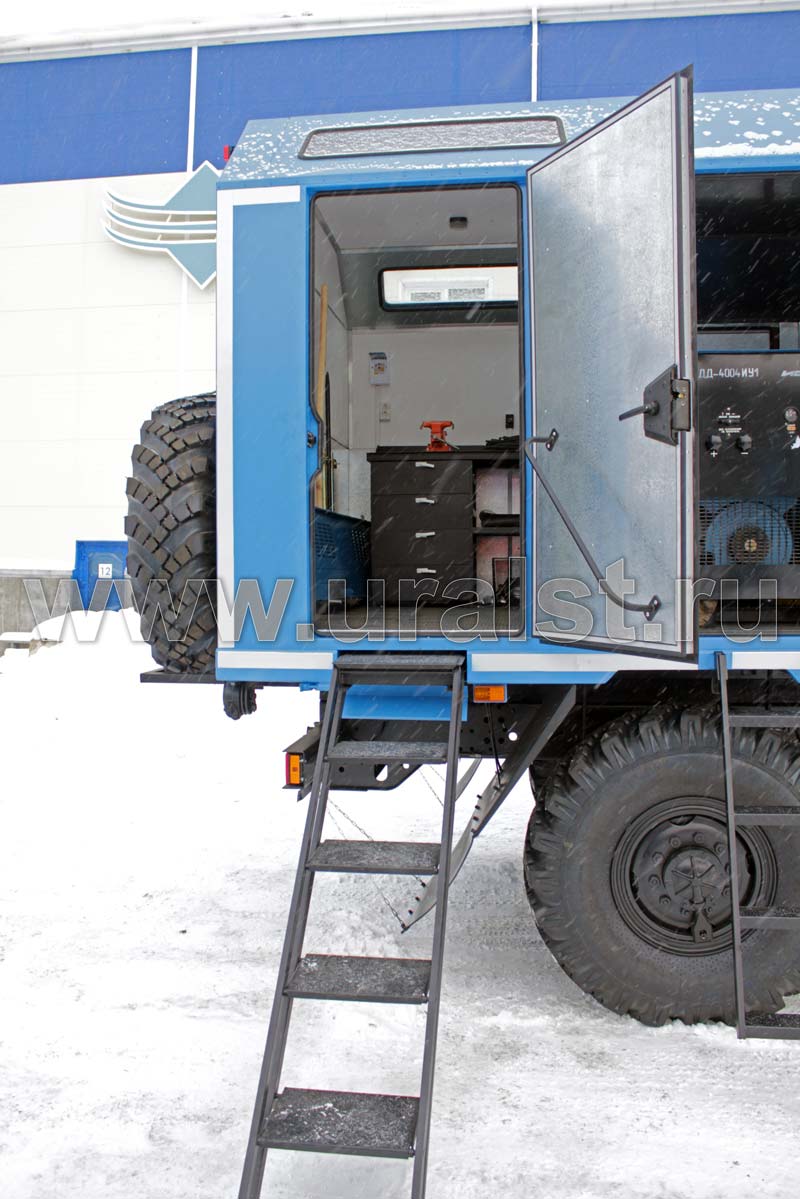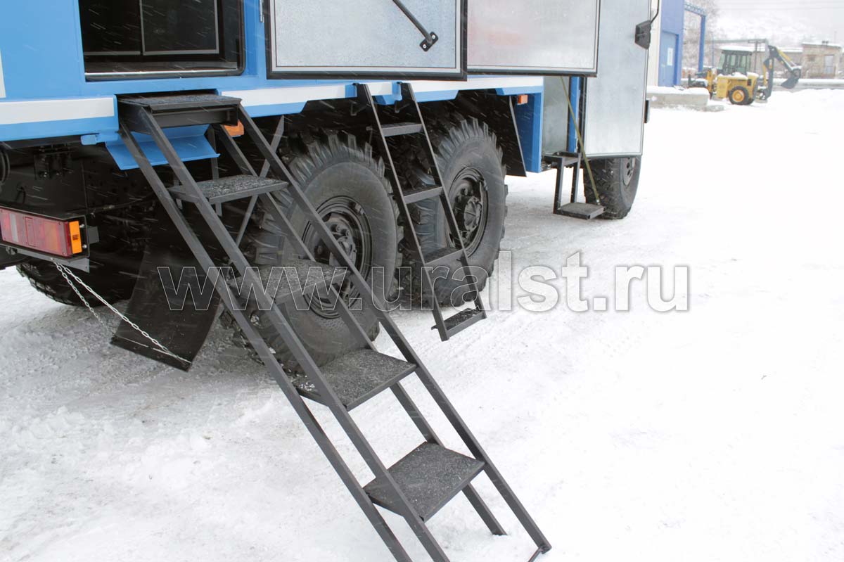 Еще одной особенностью автофургона являются выдвижной трап и съемная лестница, по которым осуществляется вход внутрь фургона и доступ к нишам. Для удобства и экономии пространства лестница и трап в транспортном положении убирается в нишу под полом автофургона. Конструкция предусматривает широкие ступеньки, по котрым легче производить спуск и подъем внутрь ремонтной мастерской.
