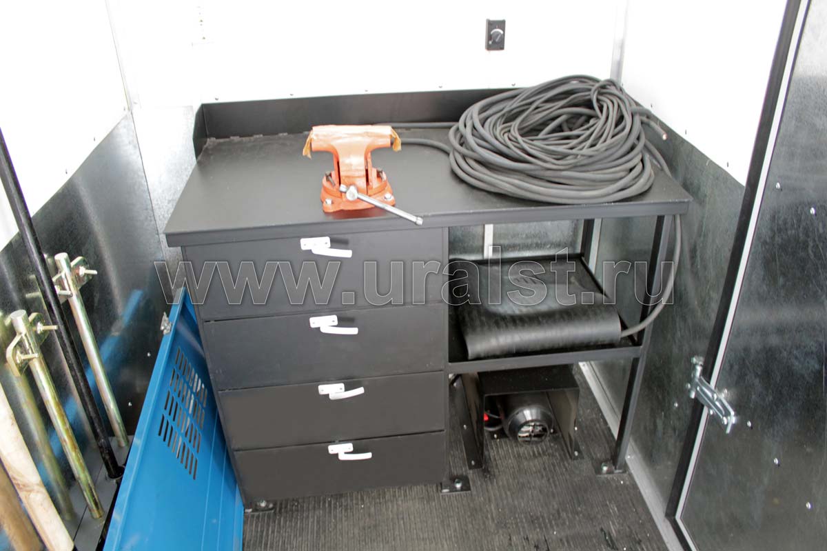 Автомобильный фургон разделен на 3 отсека: отсек для перевозки рабочей бригады, отсек мастерскую и отсек сварочного агрегата.